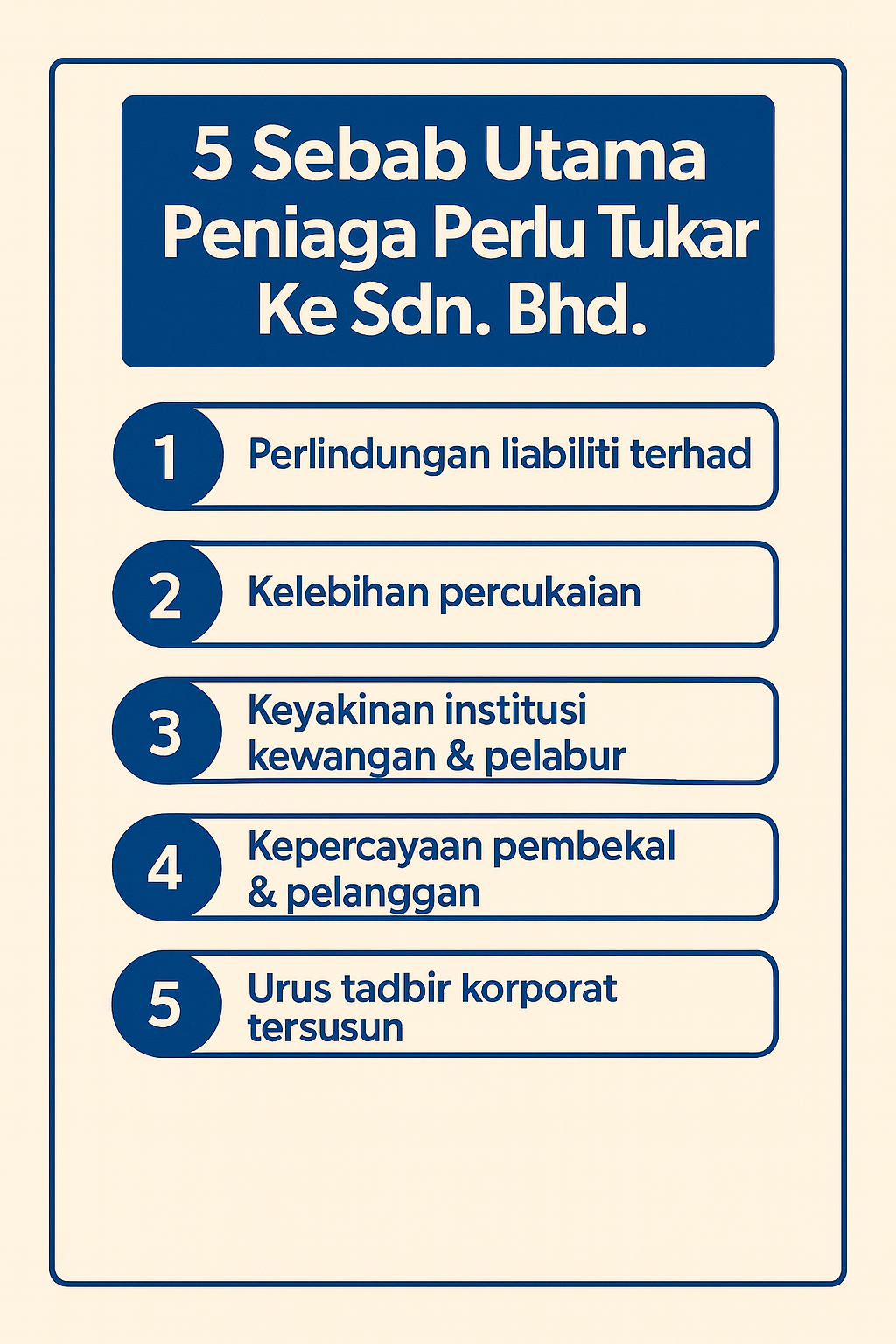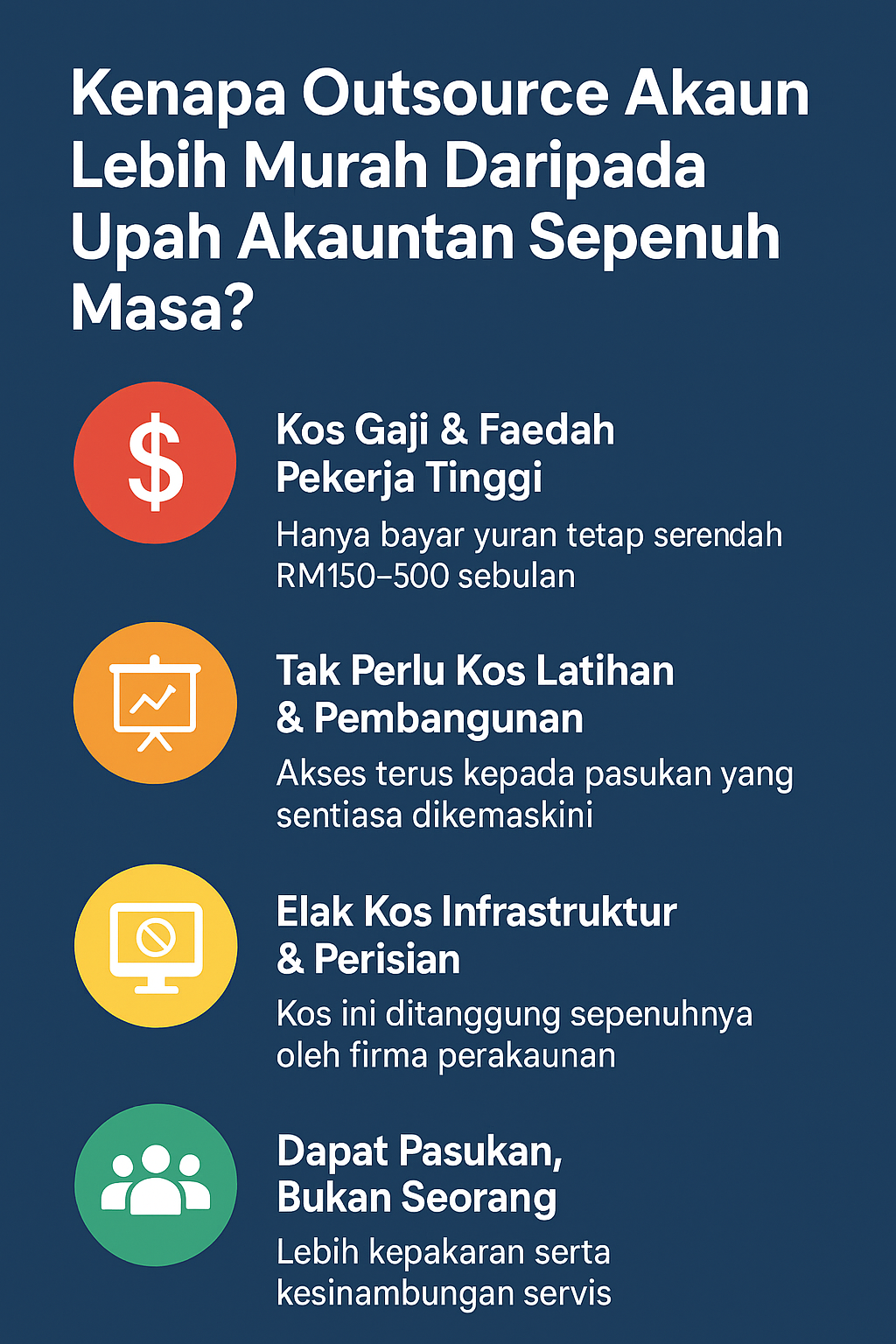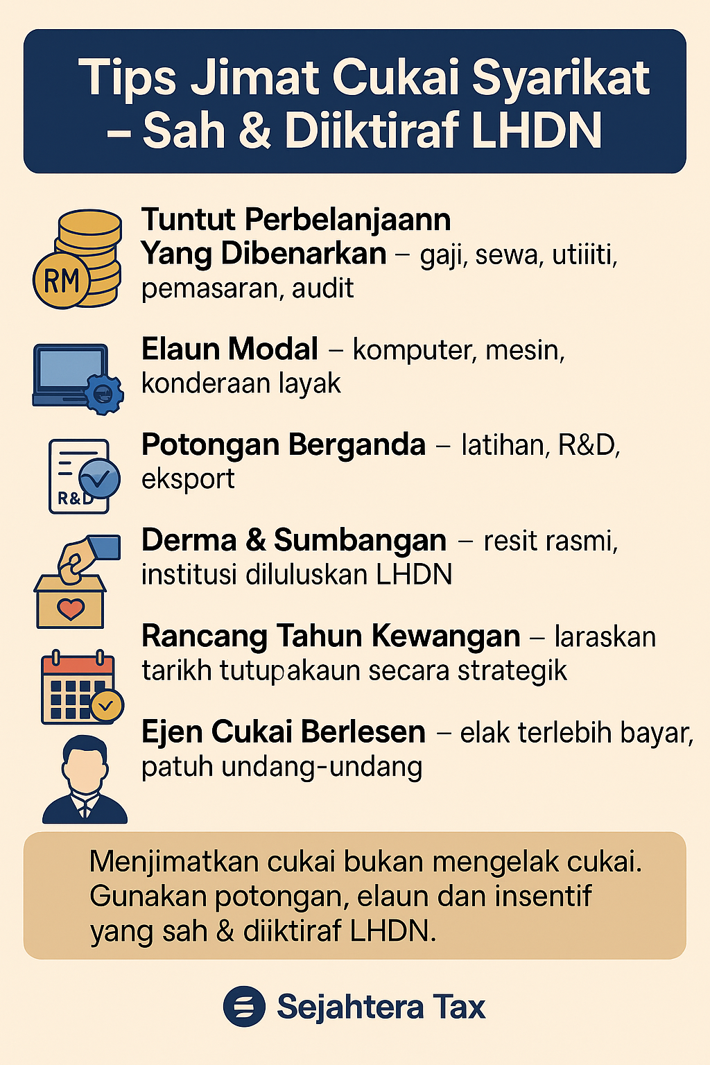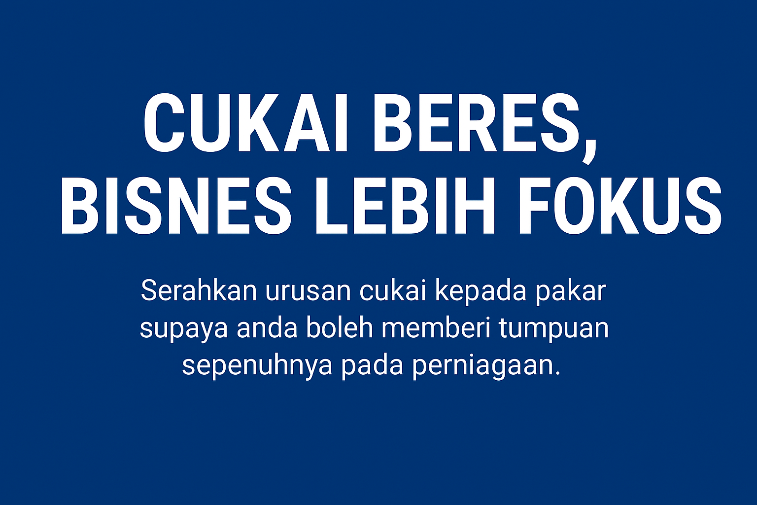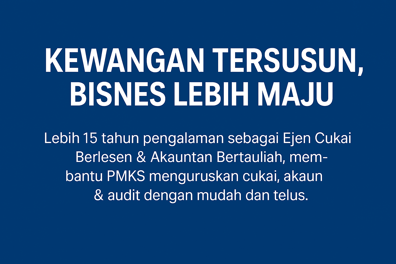 "Anda hanya perlu fokus sepenuhnya terhadap pembangunan dan strategi perniagaan syarikat anda. Biarkan kami sebagai Konsultan Cukai Berlesen dan Akauntan Bertauliah anda yang akan menguruskan sepenuhnya hal ehwal berkaitan percukaian dan perakaunan syarikat anda secara efisen dan profesional."
